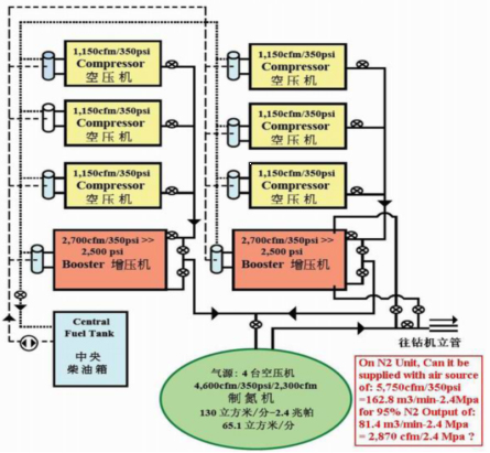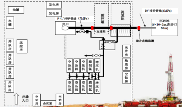 工藝流程: 空壓機- 制氮機-增壓機-流量計管匯-霧化泵-立管管匯-井內(nèi)-環(huán)空-井口-排砂管線